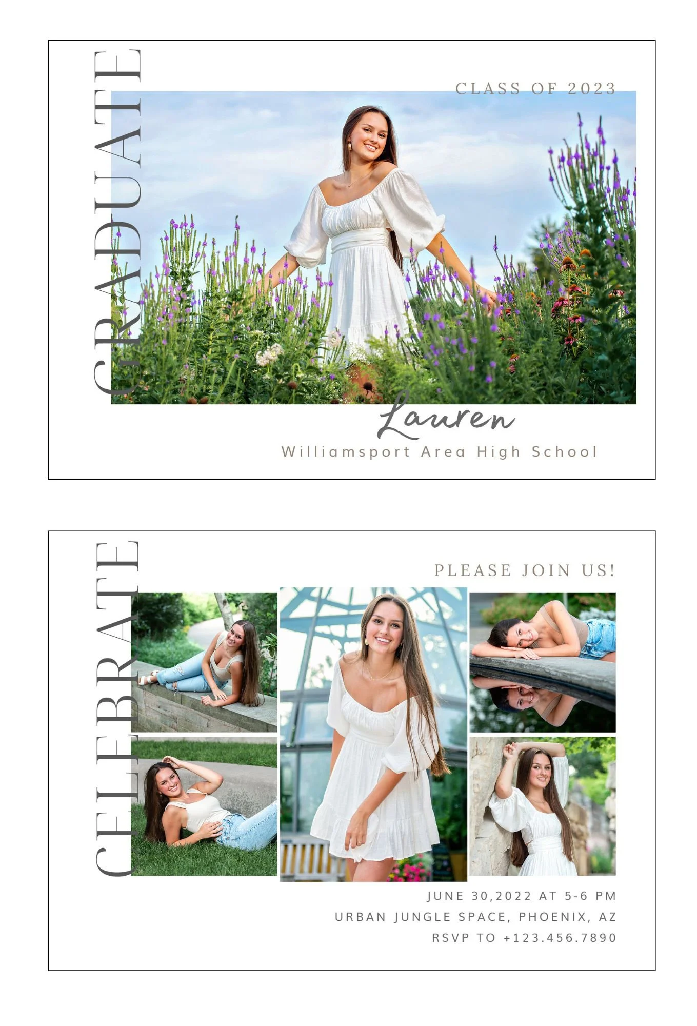 FULLY CUSTOMIZABLE. Cards are customizable, and I will work with you to design your announcement. Most fonts and colors can be adjusted, and we can arrange your photos on the back of the card along with your graduation date, party details, or other information you'd like to include.